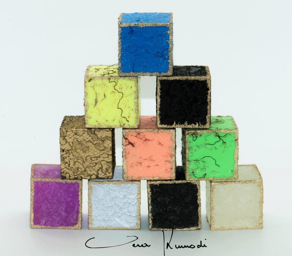 Sa dernière création ? Des cubes en acier à l’aspect brut avec ses tranches dorées à la feuille d’or qui s’imbriquent au gré des envies et de la vie. Une exposition colorée et lumineuse que nous propose la Galerie Bettina Con Arnim pour découvrir le monde sensible de Vera Kunodi.