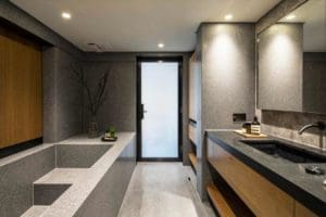 La villa est habillée de couleurs neutres et de matériaux naturels tels que le bois, les dalles de granit gris et le marbre rouge qui favorisent méditation et sérénité.