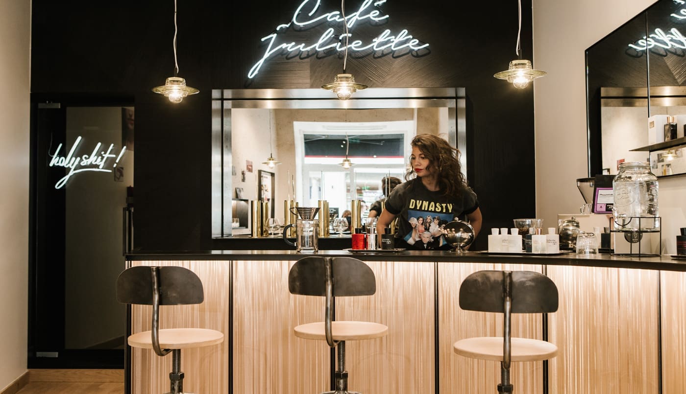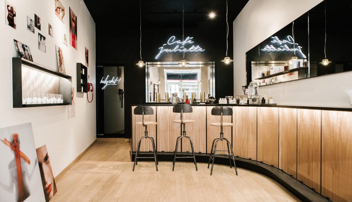Café Juliette se veut lieu de vente mais également lieu de découverte, à travers différentes surprises pour le moins originales. Dans un cadre à a fois chic et atypique, vous pourrez siroter tasses de café et coupes de champagne au bar mis à disposition, tester les parfums grâce au système de paper scent, et bien d’autres choses encore.
