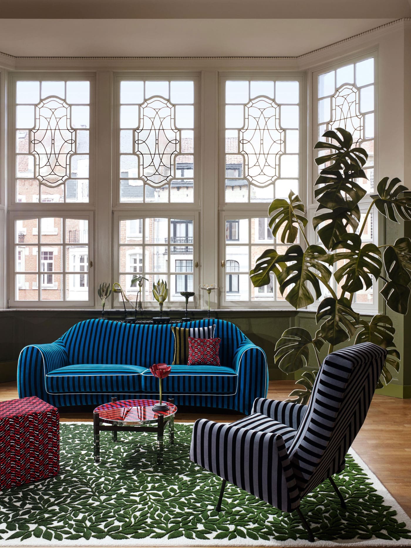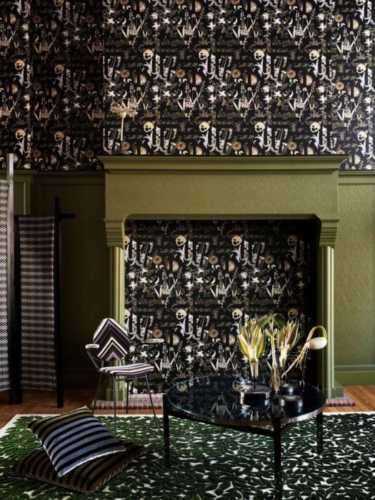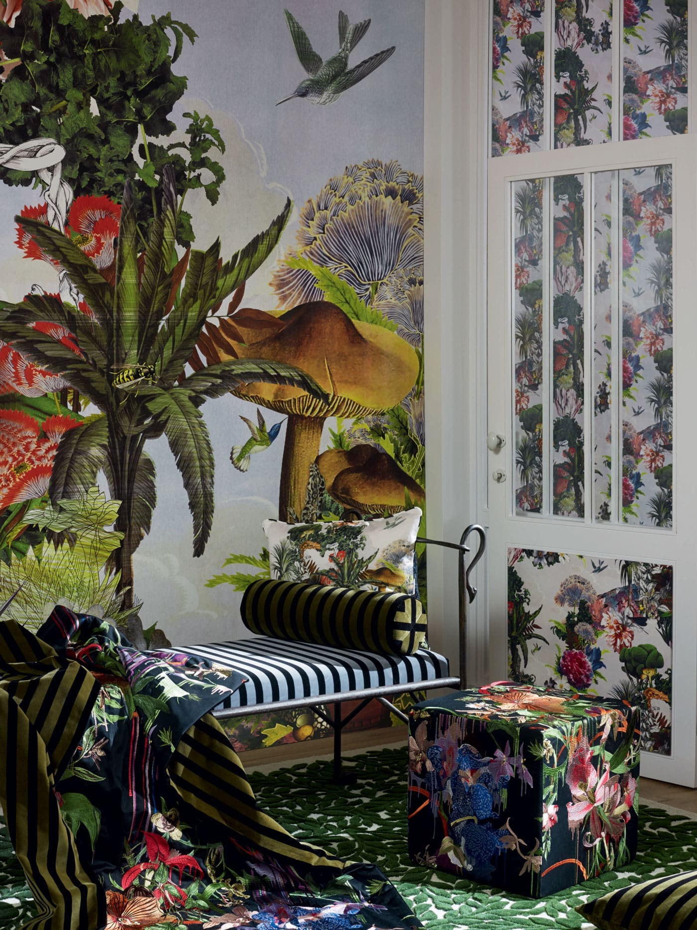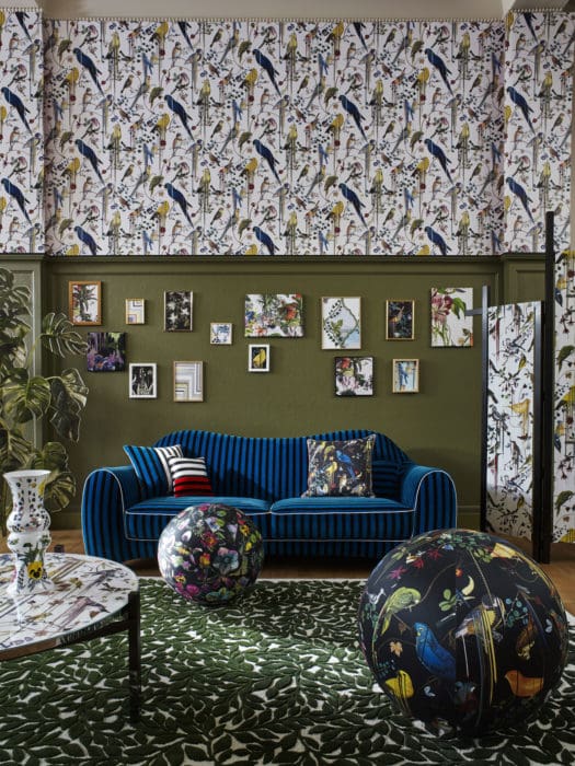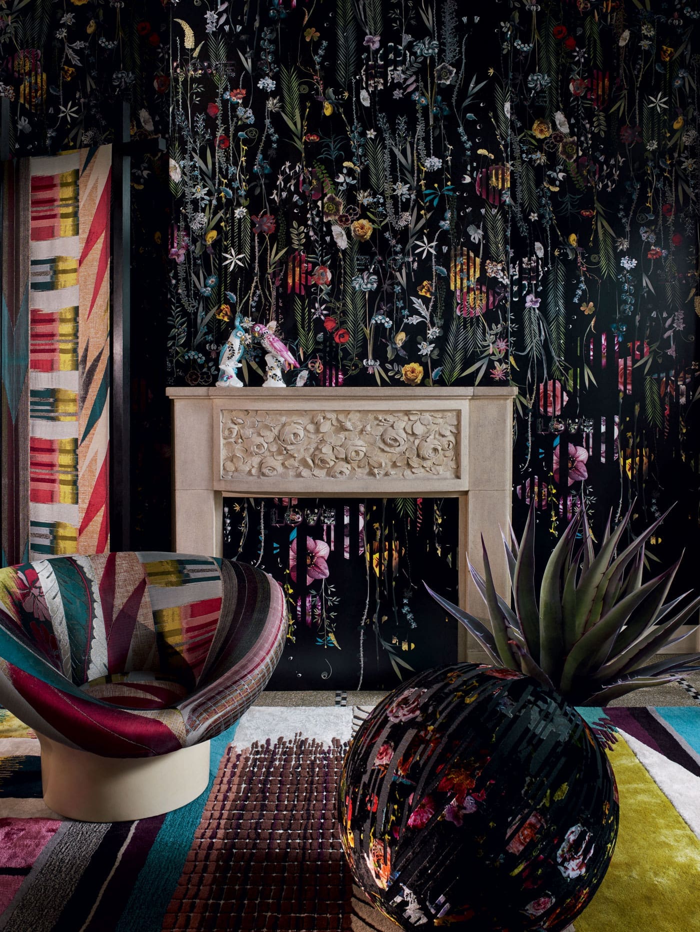 « Histoires Naturelles » nous plonge dans un univers onirique : les murs s’animent et des oiseaux gazouillants surgissent avec le motif « Birds Sinfonia », les fauteuils, gainés du jacquard chromatique « Geisha », évoquent des lys géants et multicolores, le papier-peint pékiné de velours « Babylonia Nights soft » nous laisse entrevoir la flore d’un jardin chatoyant…