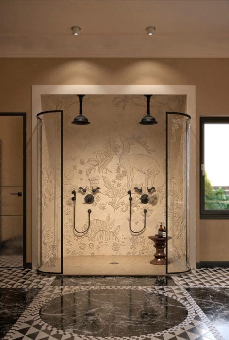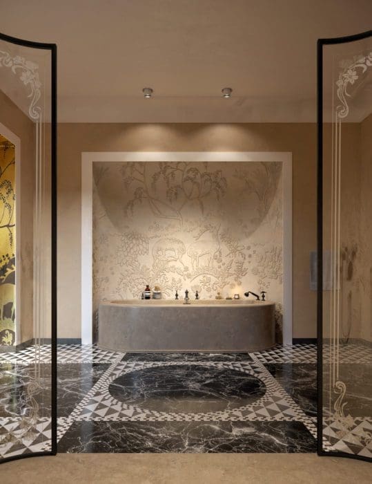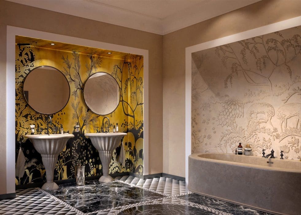 La salle de bains mise en scène par Volevatch incarne une parfaite symbiose entre Art Nouveau et Art Déco. Le marbre beige, noir et blanc au sol, dessine des motifs géométriques encadrés de marbre blanc tandis qu’un chemin de marbre noir relie le lavabo à la baignoire. La baignoire de style épurée contraste avec les lavabos plus travaillés en marbre de Hauteville. Le parement en staff au-dessus de la baignoire est richement composé d’ornements représentant des dessins animaliers et des motifs végétaux. De la même manière, le papier peint De Gournay “Rateau” de la Collection Diaghilev s’inspire de l’art début XXe et se décline dans les couleurs du dessin original sur papier doré Deep Rich Gold. Délicatement, les robinets oiseaux de Volevatch se posent sur les différents éléments sanitaires.