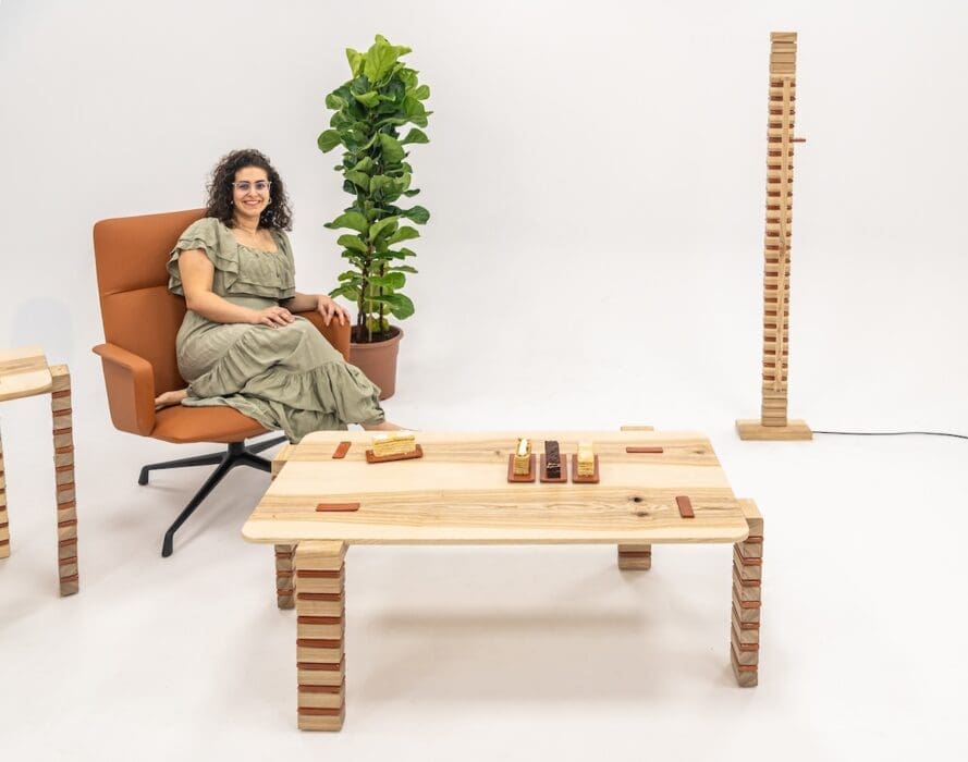 Pour imaginer sa collection de mobilier Mille Feuille, Nourhan Rahhal, fondatrice de Design&, s’est inspirée de la superposition propre à la pâtisserie française. Résultat : un dialogue sensible entre matière et couleur. L’alternance entre une strate de bois et une strate de céramique est parfaitement équilibré, proposant un rendu subtil et intéressant pour l’œil comme pour la main. Mention spéciale pour le lampadaire, ludique et graphique.
