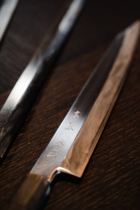 Les conseils du chef : un couteau pour chaque usage, légume, viande, poisson. À acheter chez un maître aiguiseur et non chez des distributeurs pour être sûr de la qualité, à partir de 99 € pièce.