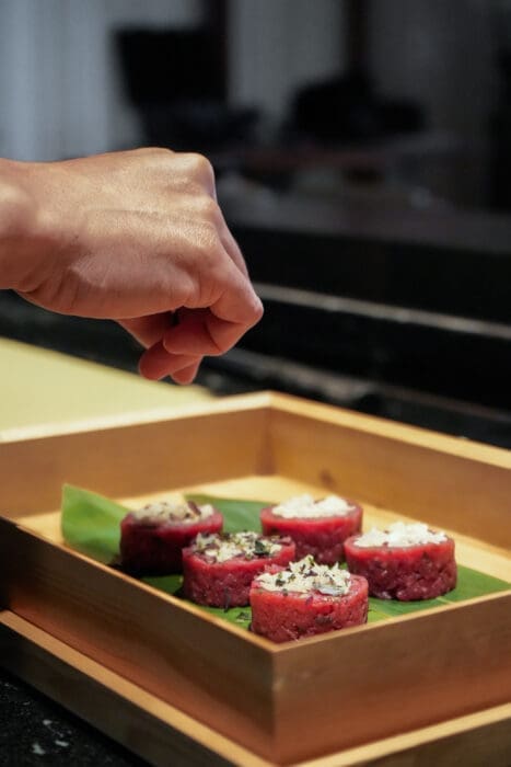 « Mon but : rendre mes convives heureux, leur révéler ma culture, mon pays, à travers ma gastronomie. À une cuisine traditionnelle, codifiée, l’omakase, qui signifie « faire confiance », j’ajoute mes touches personnelles, joue sur la saisonnalité, le mariage de produits japonais, les sauces, les épices, les légumes, avec des ingrédients locaux, viandes, poissons, en particulier. Je recherche toujours des textures, des alliances nouvelles pour créer des goûts inhabituels, surprendre, enchanter, établir le dialogue, l’échange. Ainsi, l’automne, j’ose les kakis séchés et les raisins muscats brillants, très aromatiques. Une de mes dernières « inventions », mon tartare de bœuf, fusion parfaite de saveurs japonaises et suisses, suscite beaucoup de questions. Je vous en livre ses secrets. »